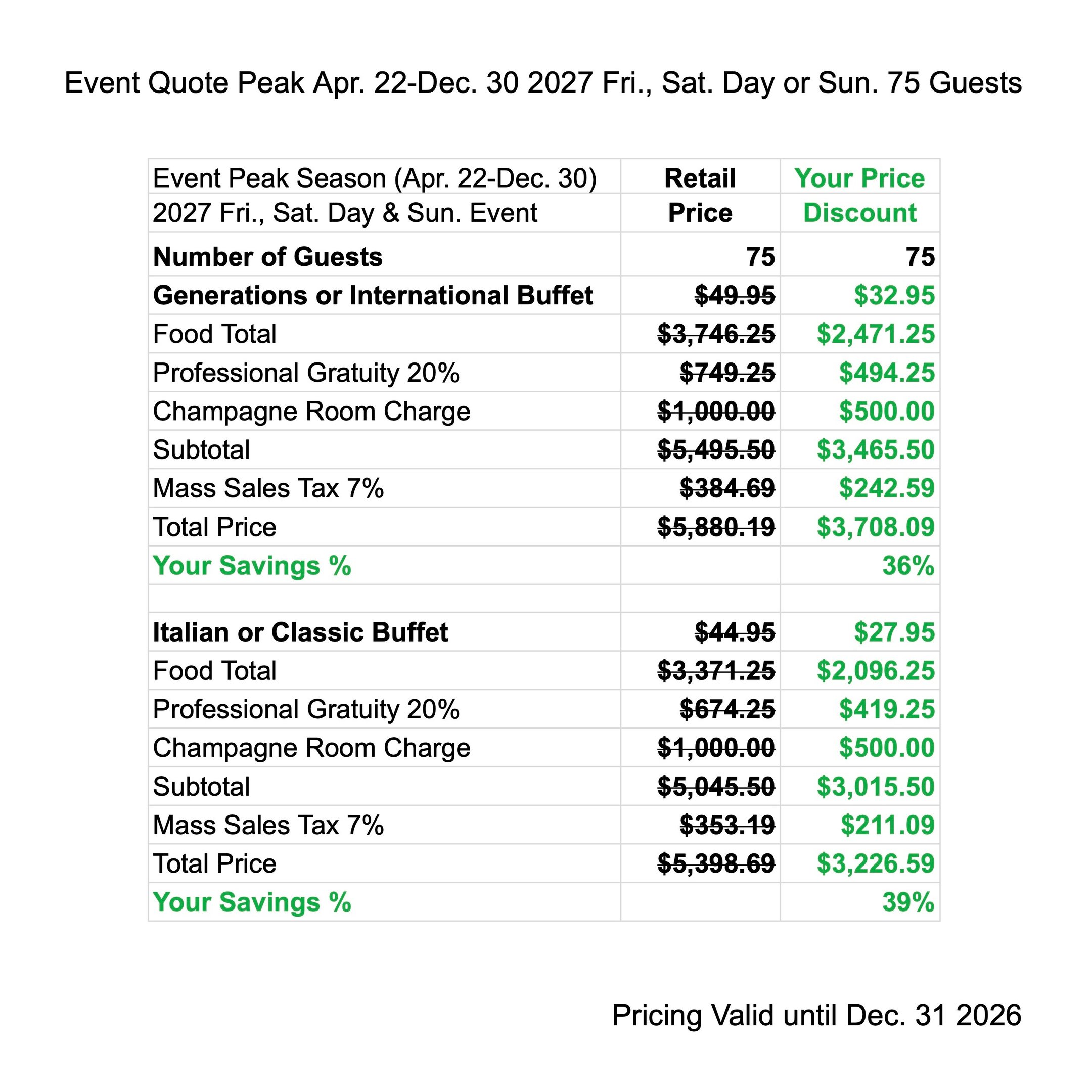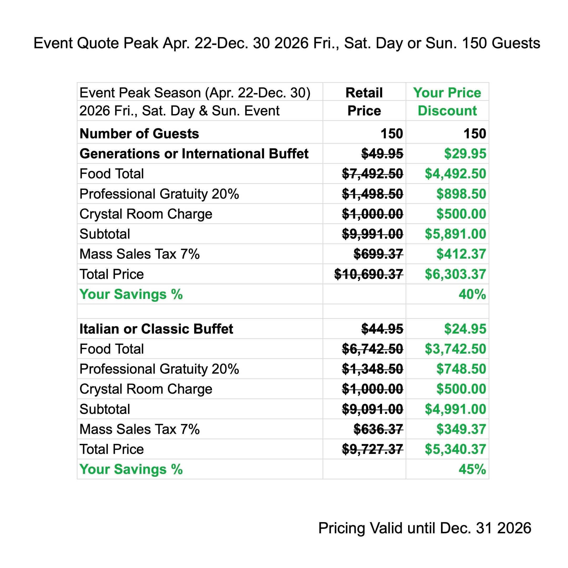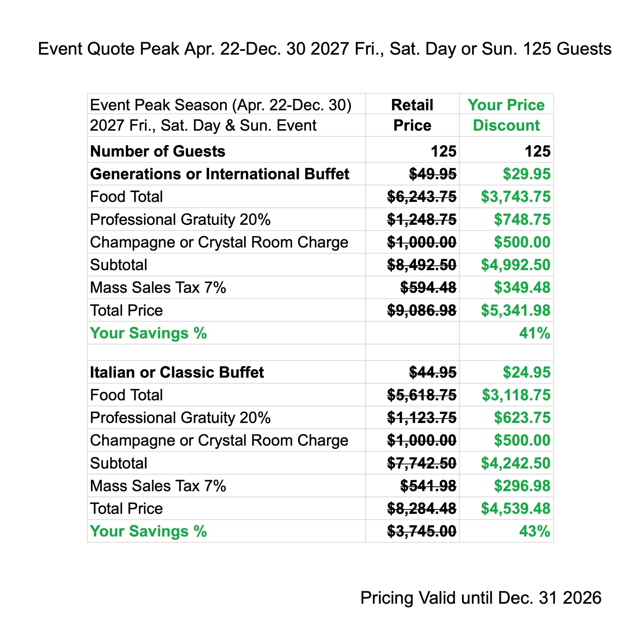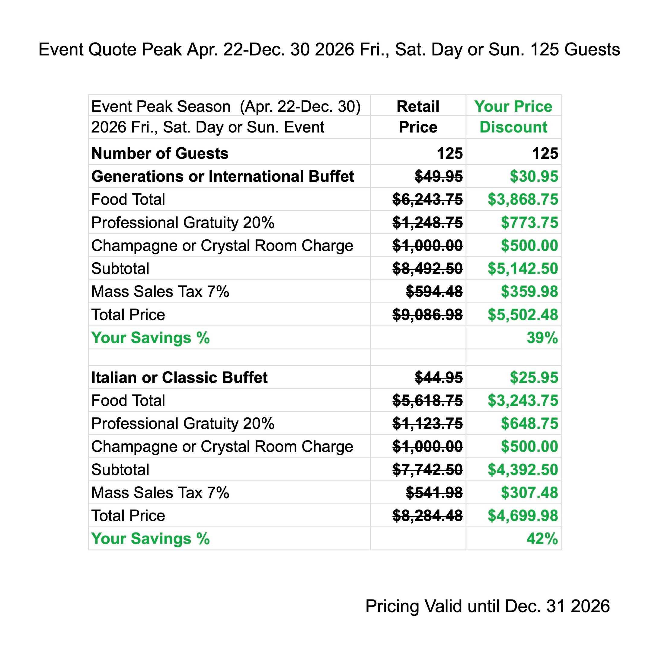 Enjoy Peak Season Discounts when you have your next Event from Apr. 22 - Dec. 30 2027. The price quote includes your buffet menu, waitstaff gratuity, linen, room charge & tax.