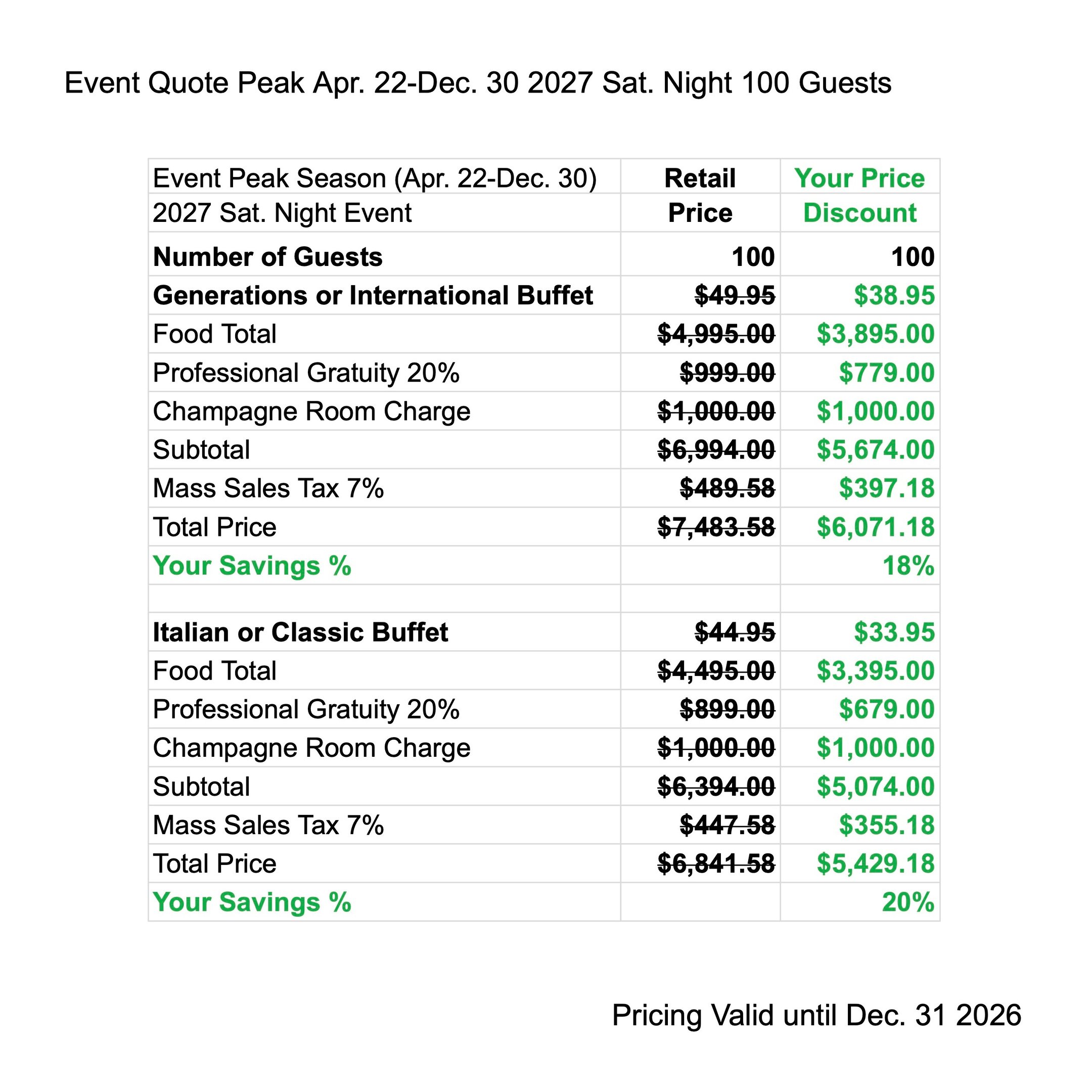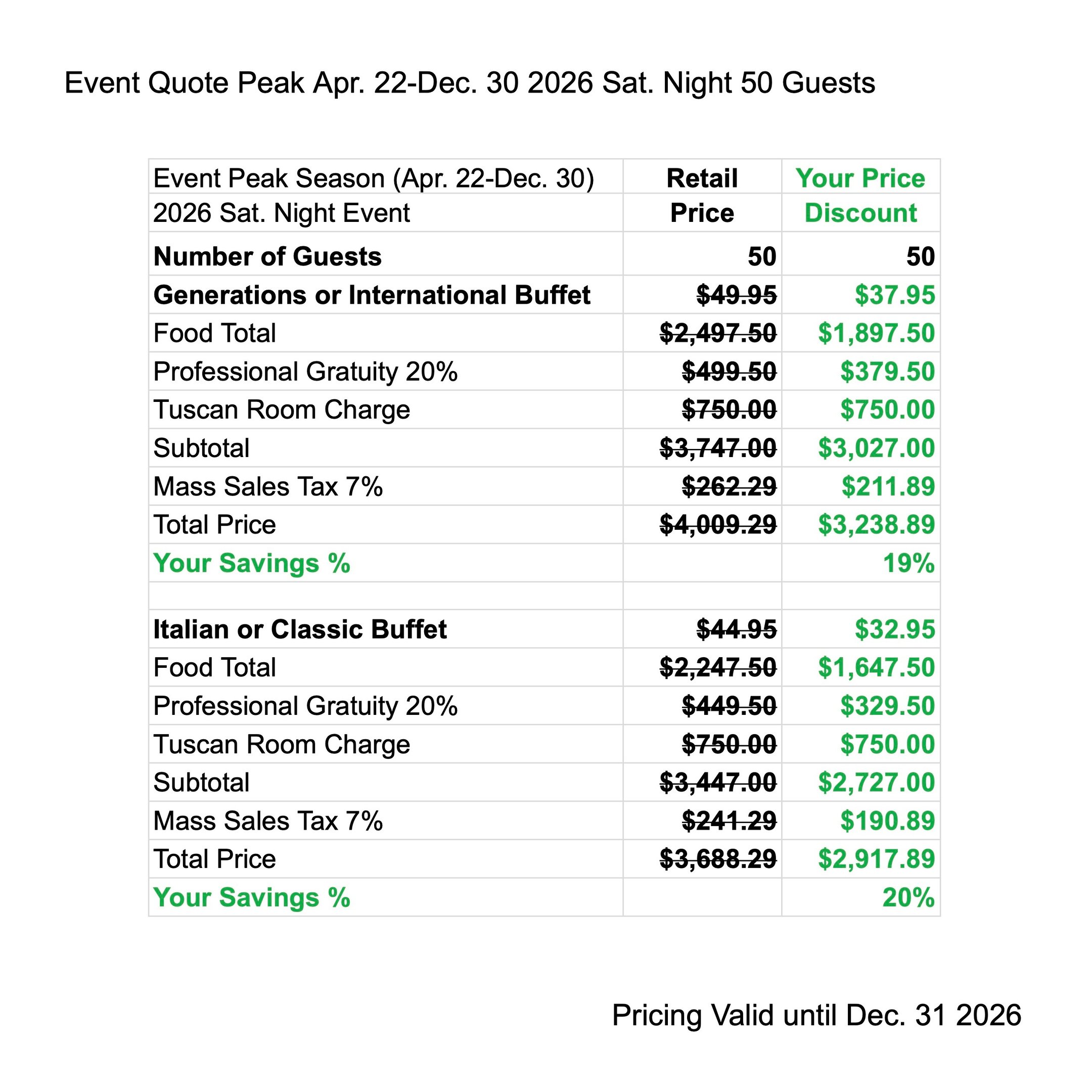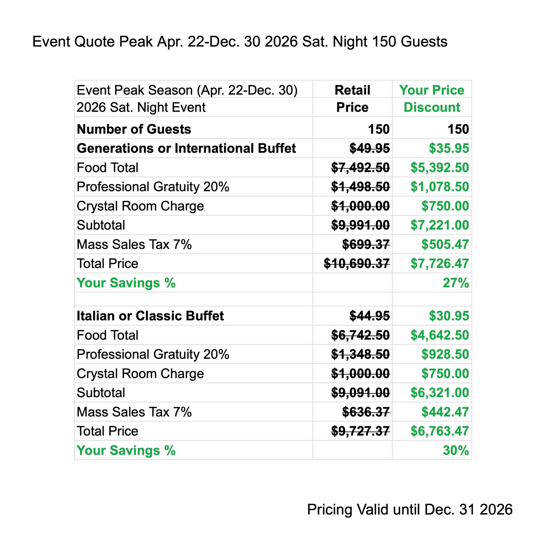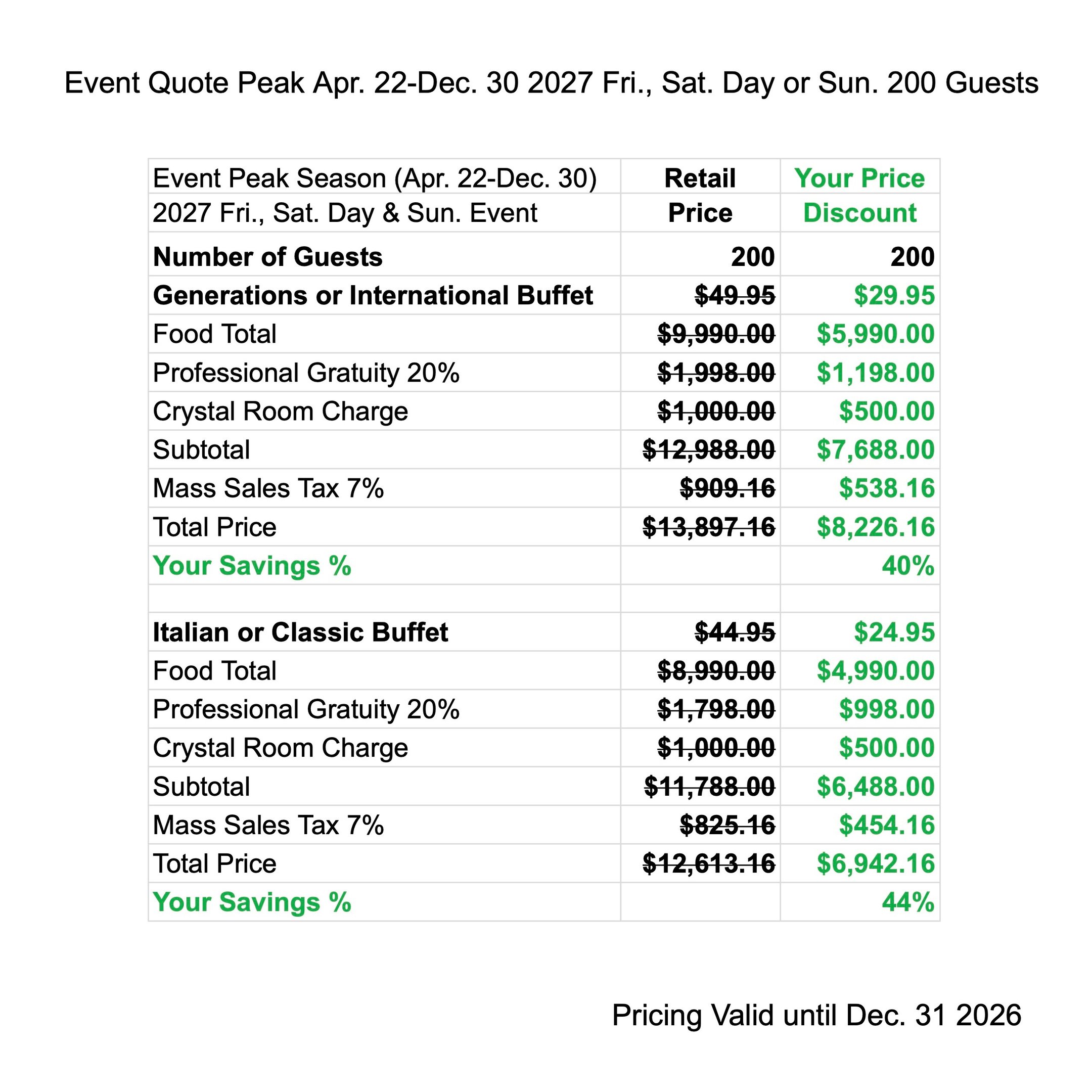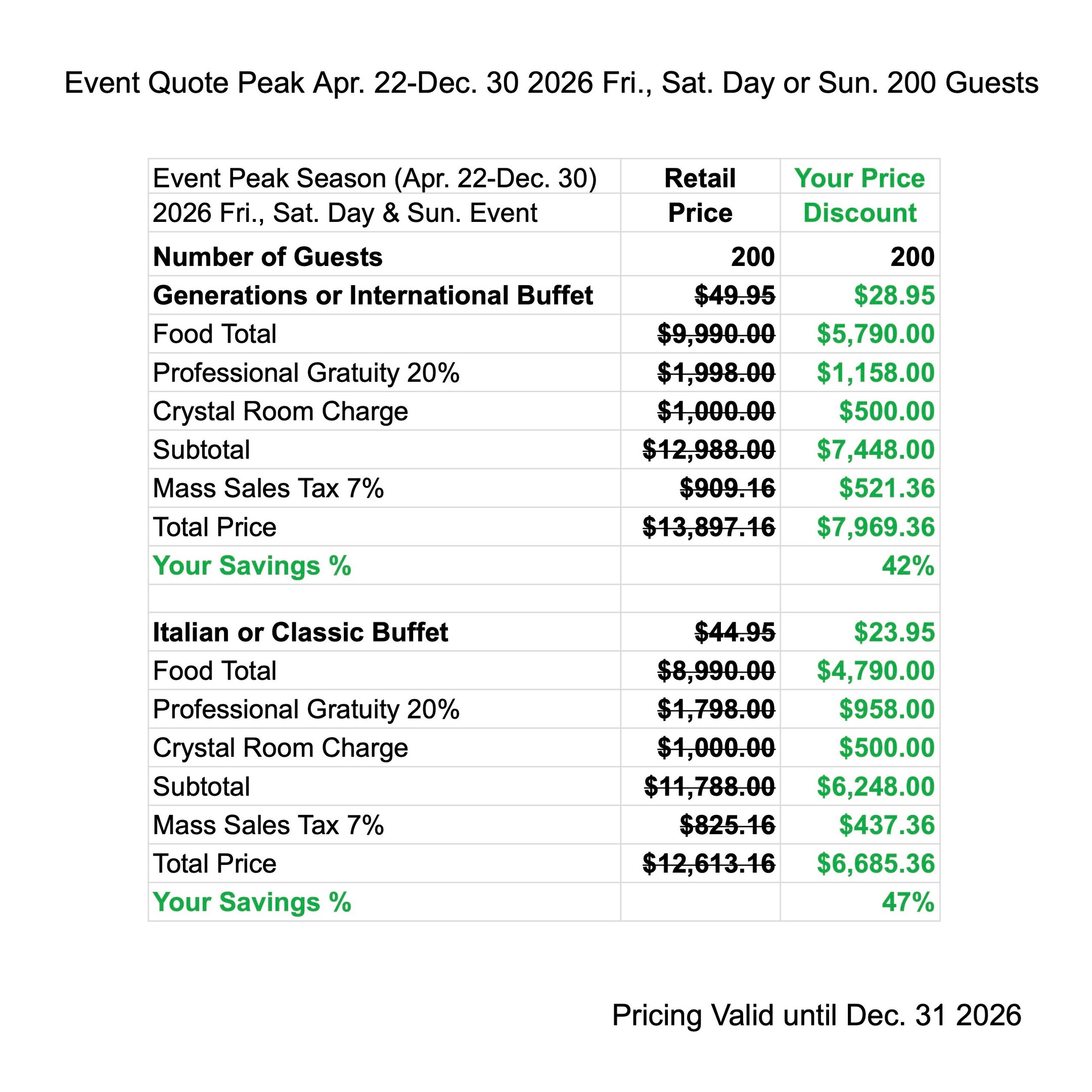 Enjoy Peak Season Discounts when you have your next Event from Apr. 22 - Dec. 30 2027. The price quote includes your buffet menu, waitstaff gratuity, linen, room charge & tax.