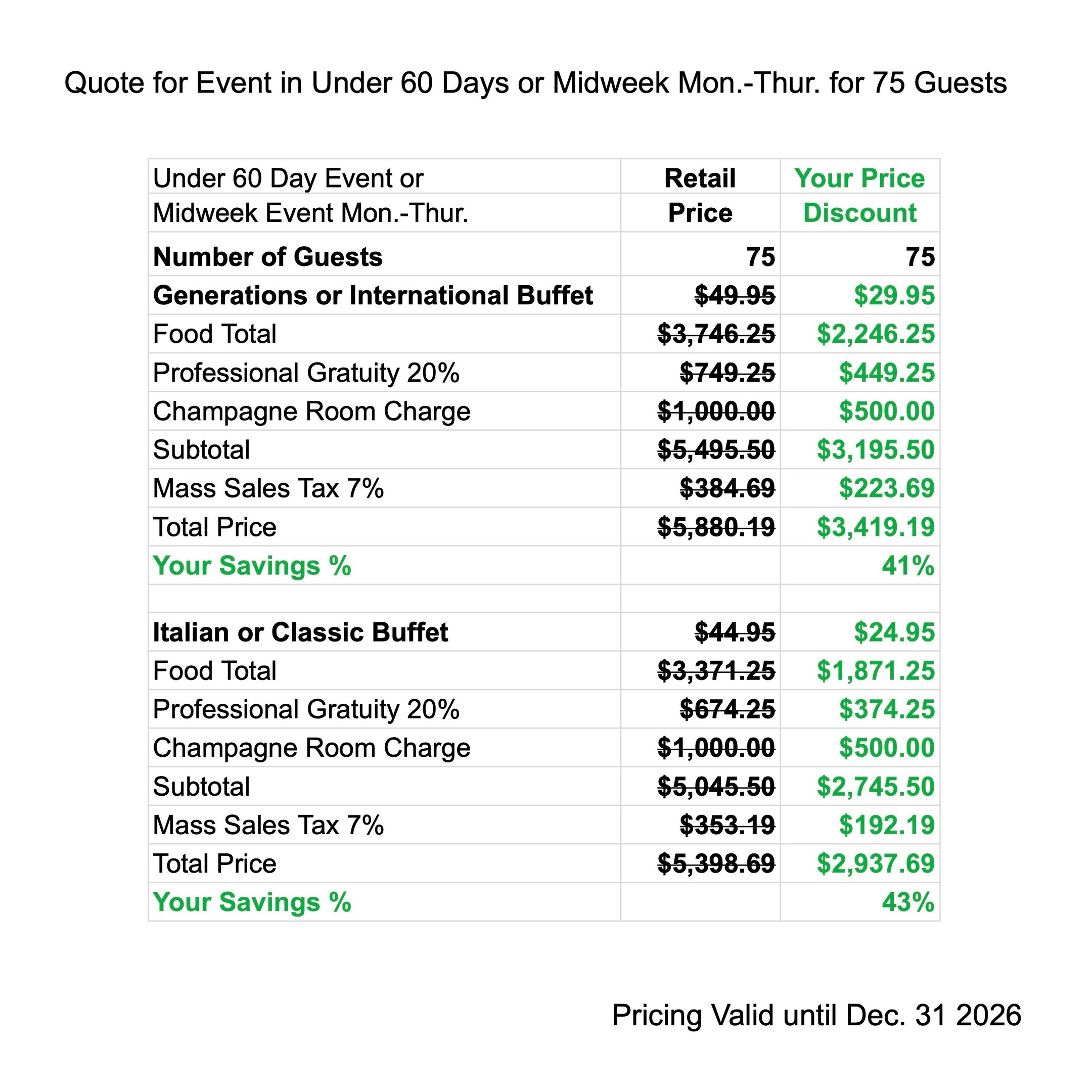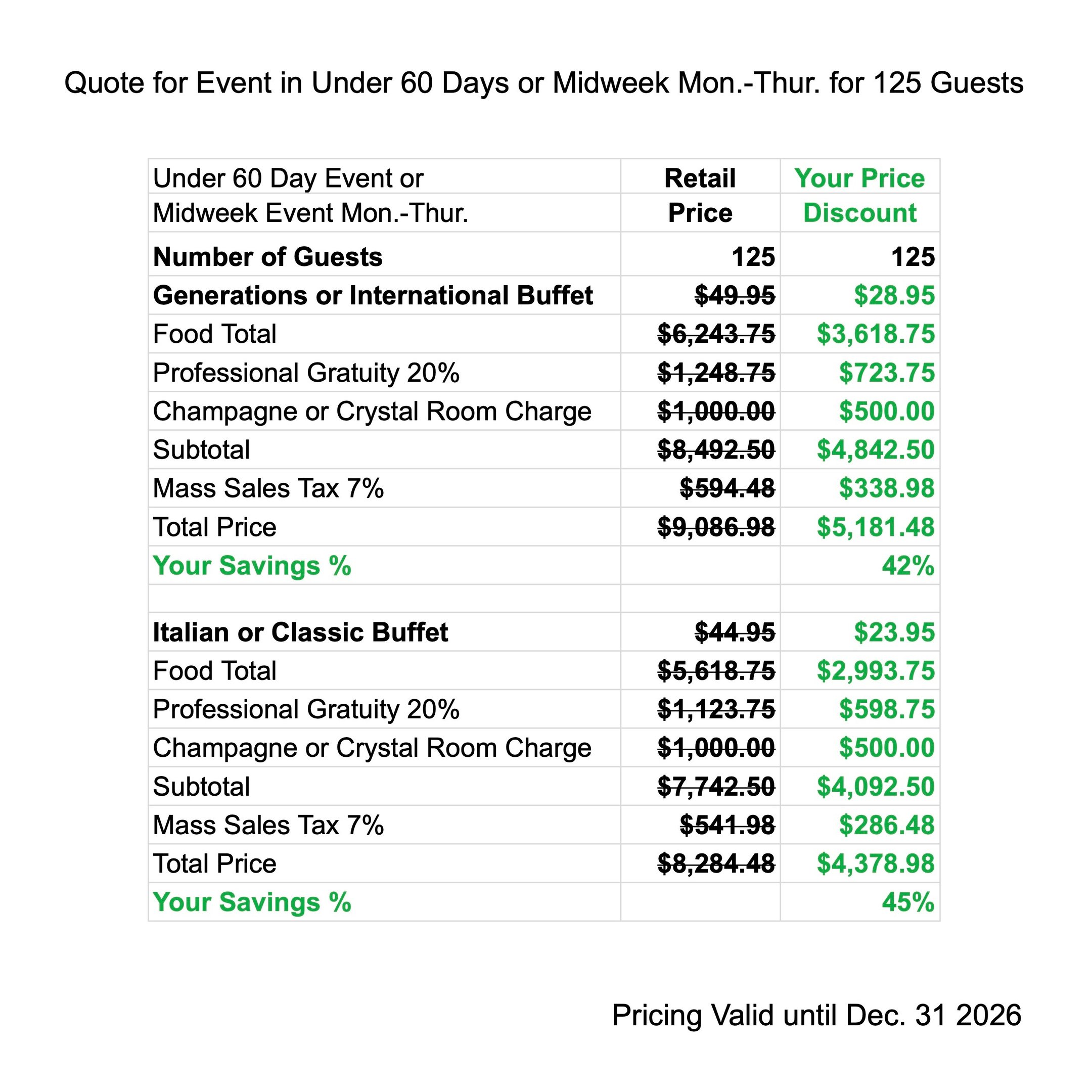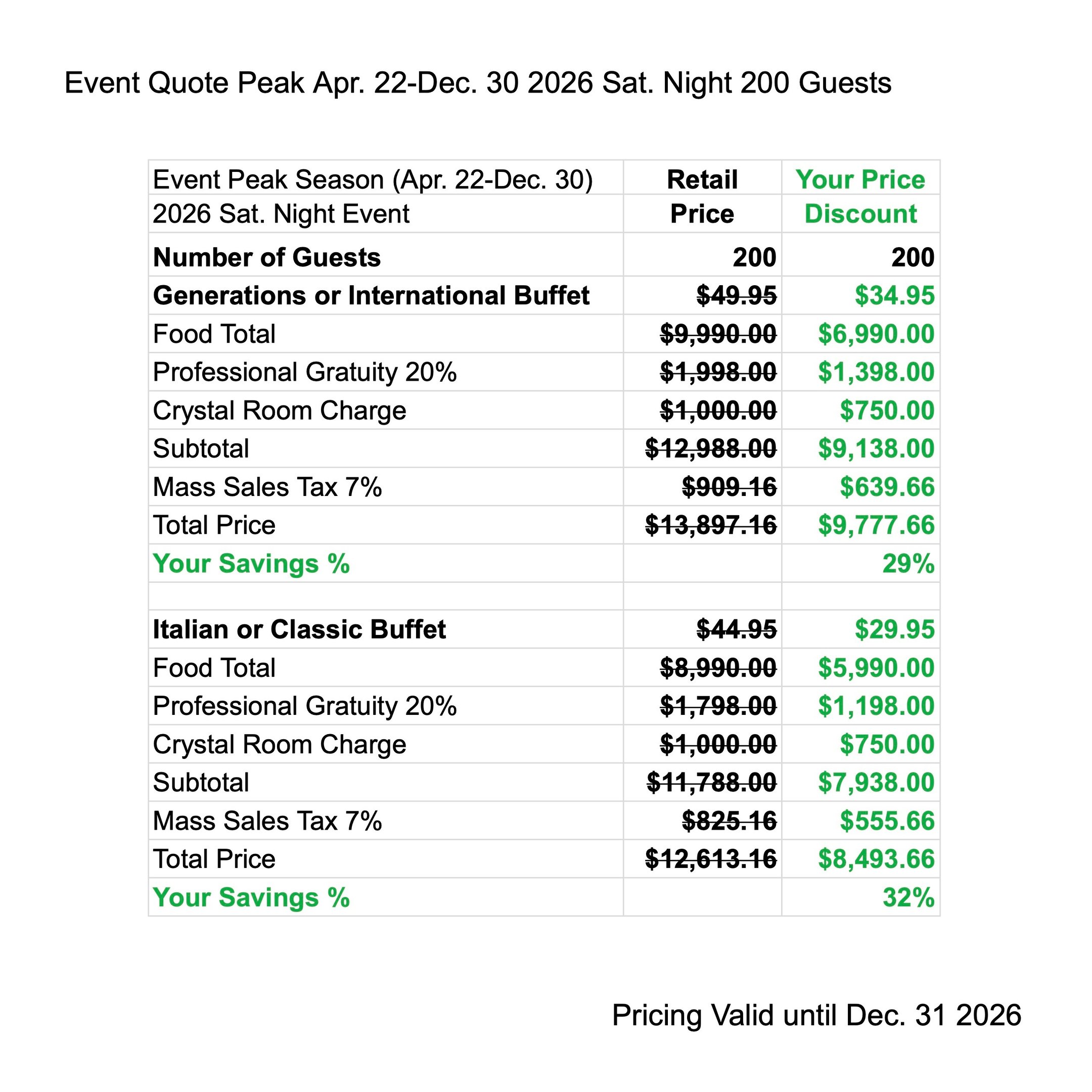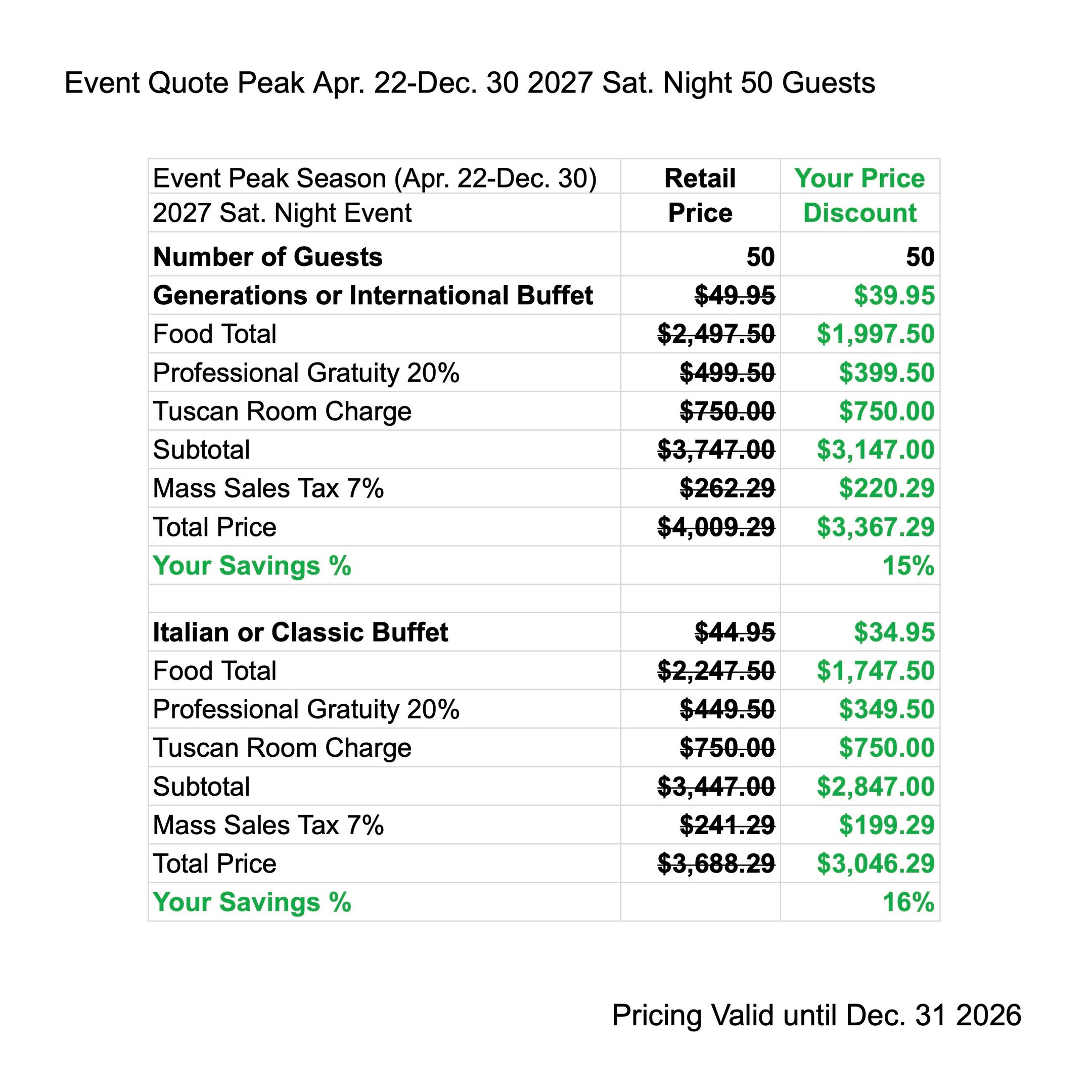 Enjoy Peak Season Discounts when you have your next Event from Apr. 22 - Dec. 30 2027. The price quote includes your buffet menu, waitstaff gratuity, linen, room charge & tax.