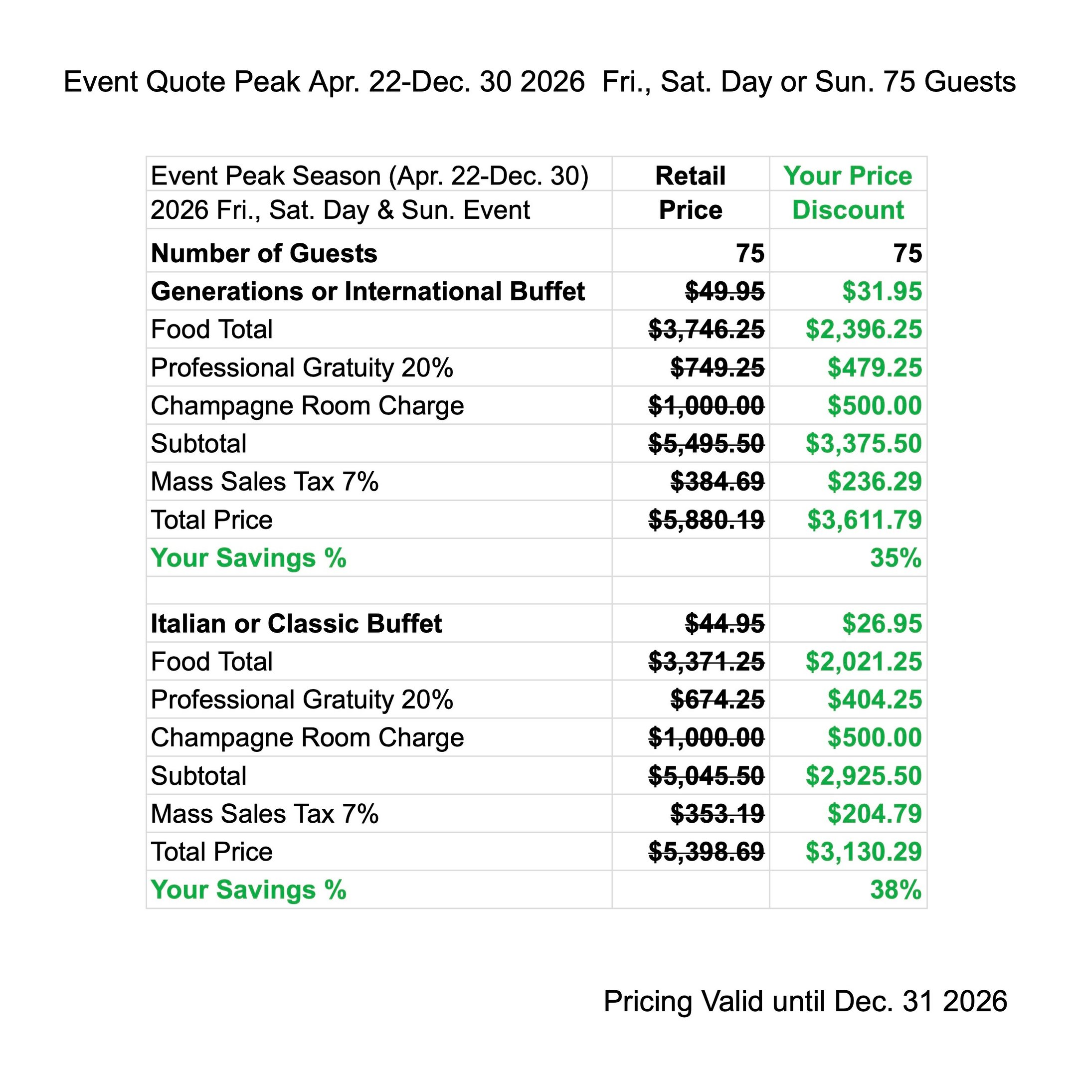 Enjoy Peak Season Discounts when you have your next Event from Apr. 22 - Dec. 30 2026. The price quote includes your buffet menu, waitstaff gratuity, linen, room charge & tax.