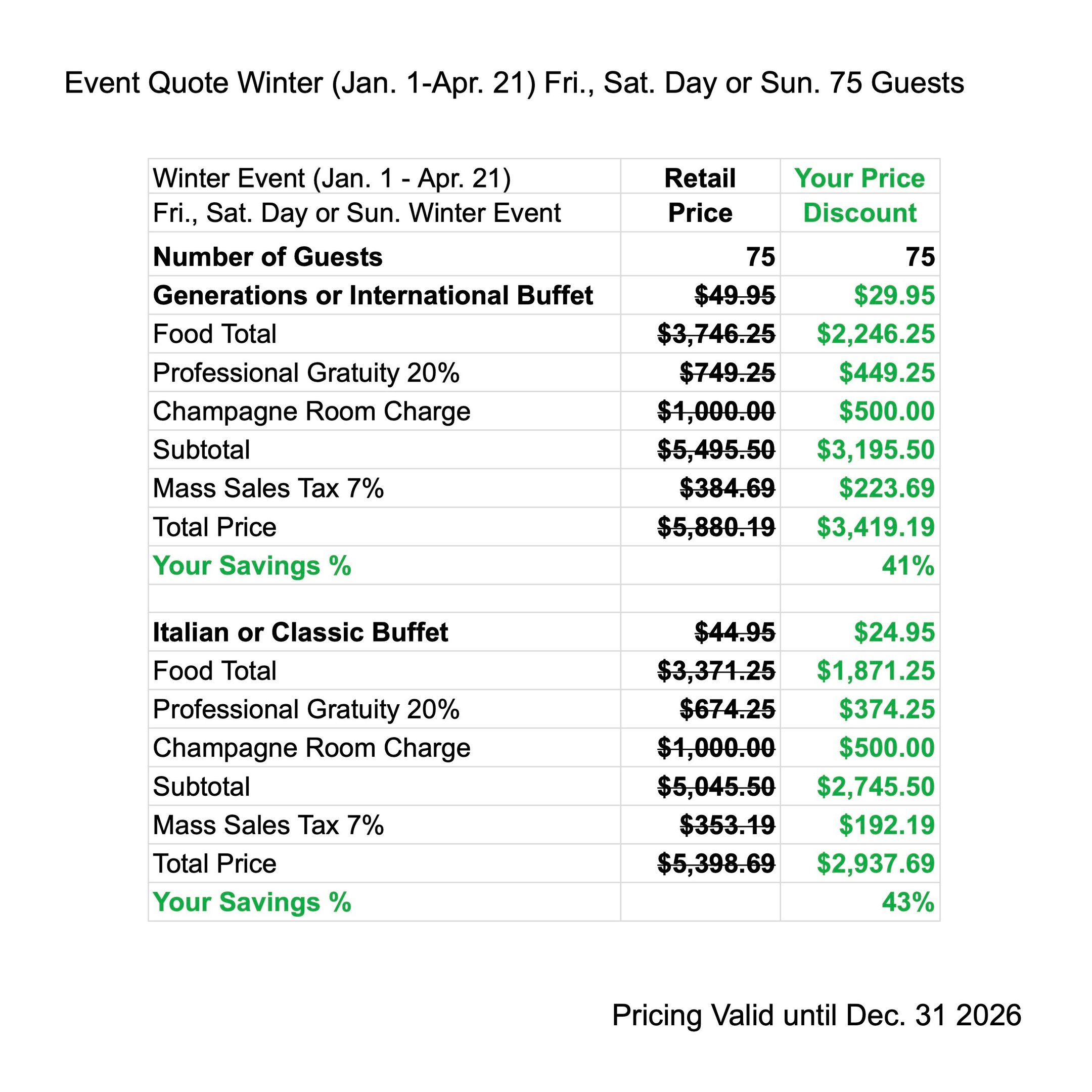 Enjoy our largest discounts when you have your Winter Event from Jan. 1 - Apr. 21. The price quote includes your buffet menu, waitstaff gratuity, linen, room charge & tax.