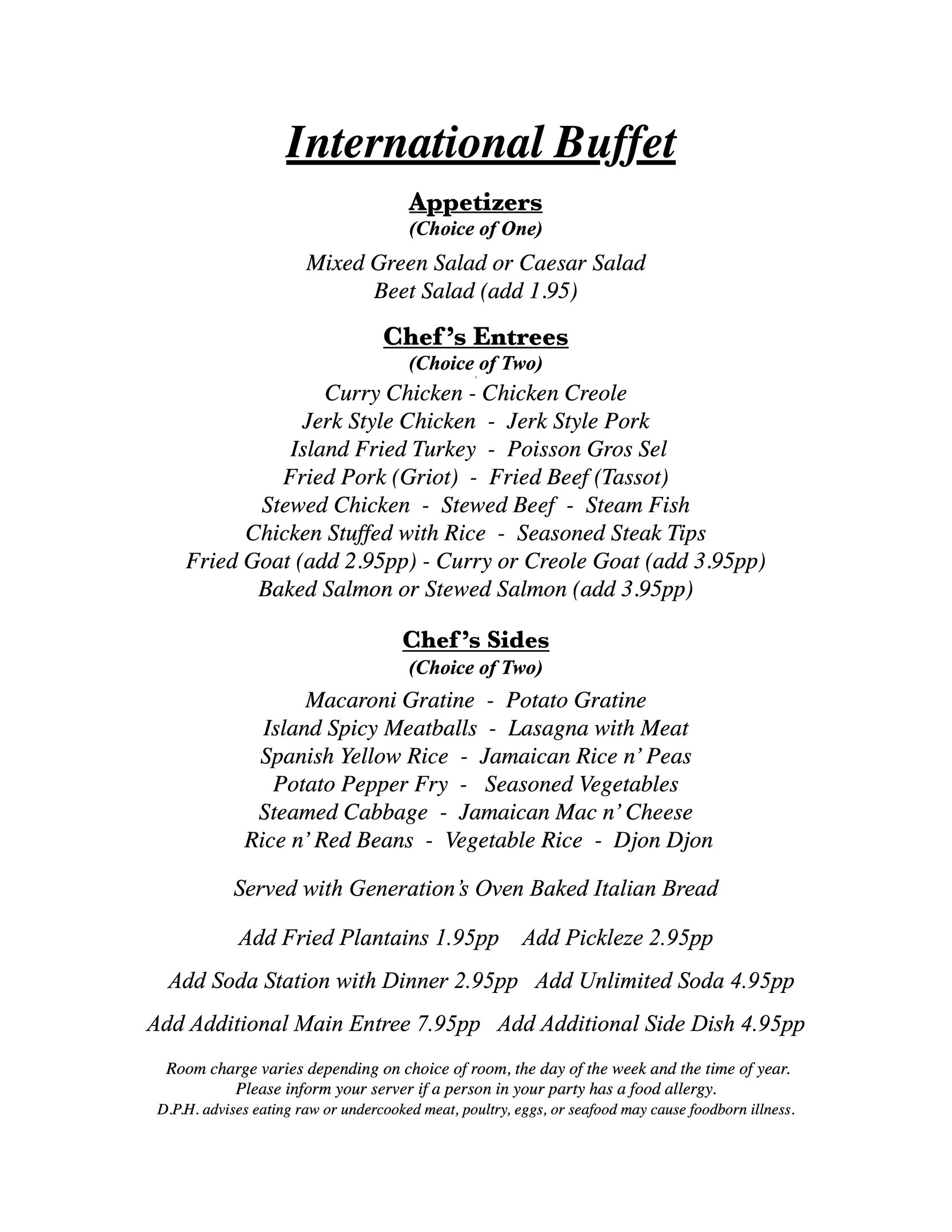 Generation's menus offer a variety of buffets from American to International cuisines. Choose a menu for your Event then pick a date from the timeframes below and click on the quote buttons that are closest to your guest count for your discounted price.